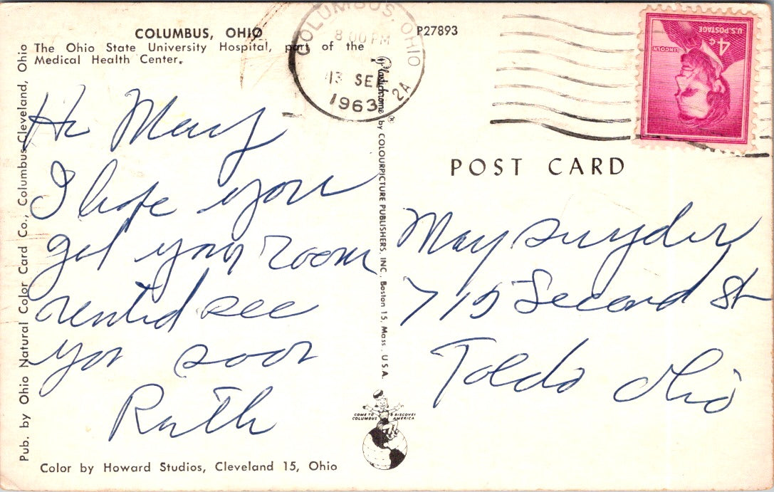 Vintage Postcard The Ohio State University Hospital Columbus Ohio Posted 1963