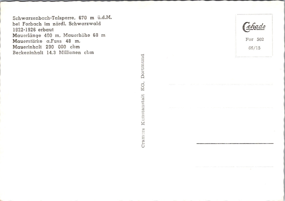 Vintage Postcard The Schwarzenbach Dam Tourist attraction in Forbach Germany