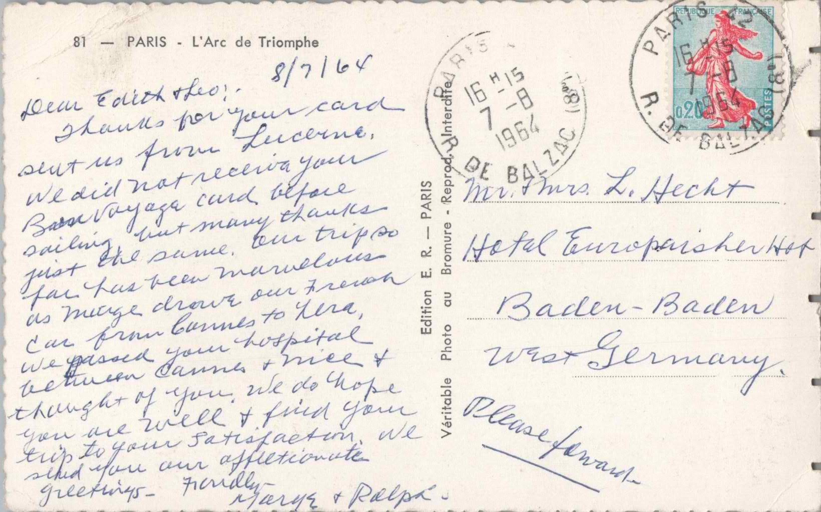 Vintage Postcard The Triumphal Arch Paris France Posted 1964