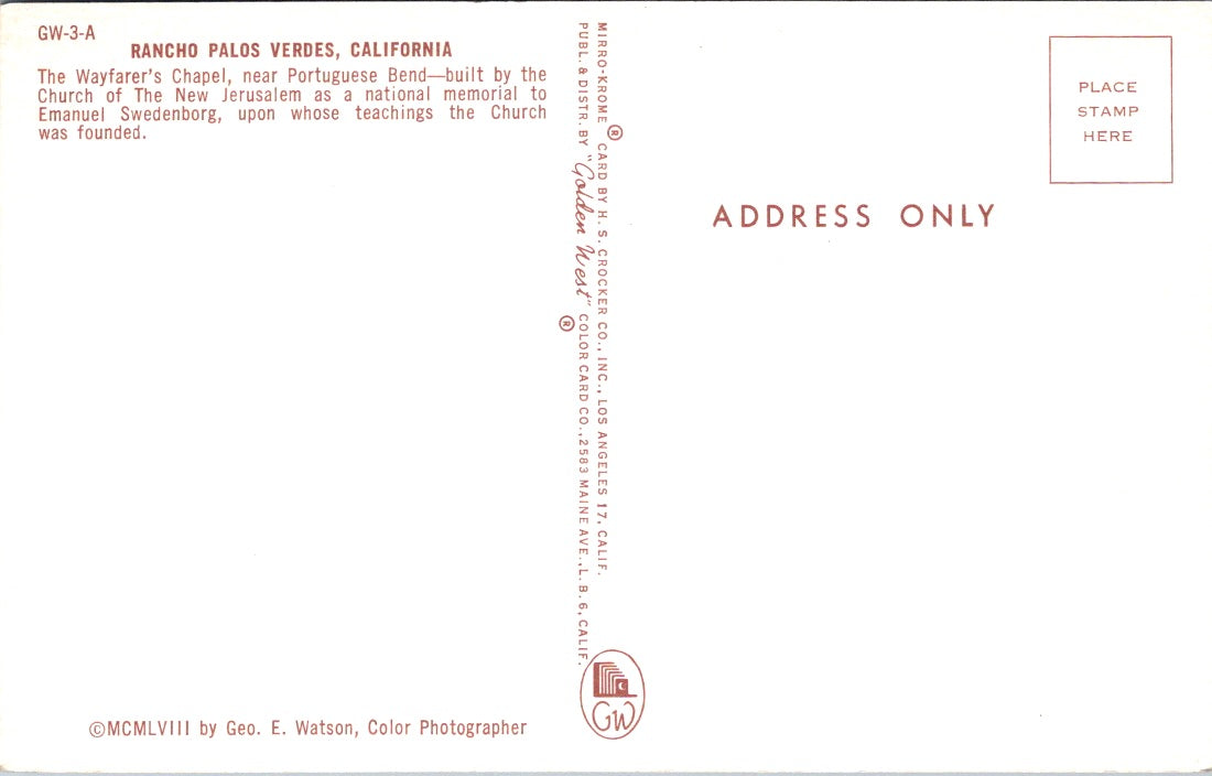 Vintage Postcard The Wayfarer's Chapel Rancho Palos Verdes California Unposted