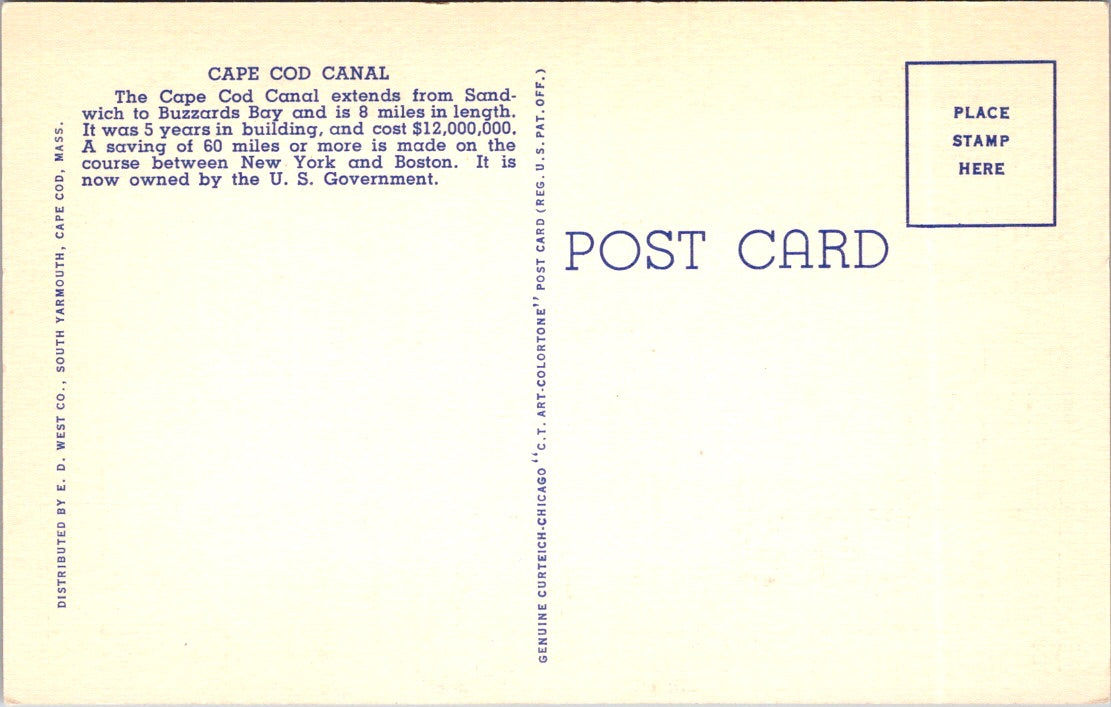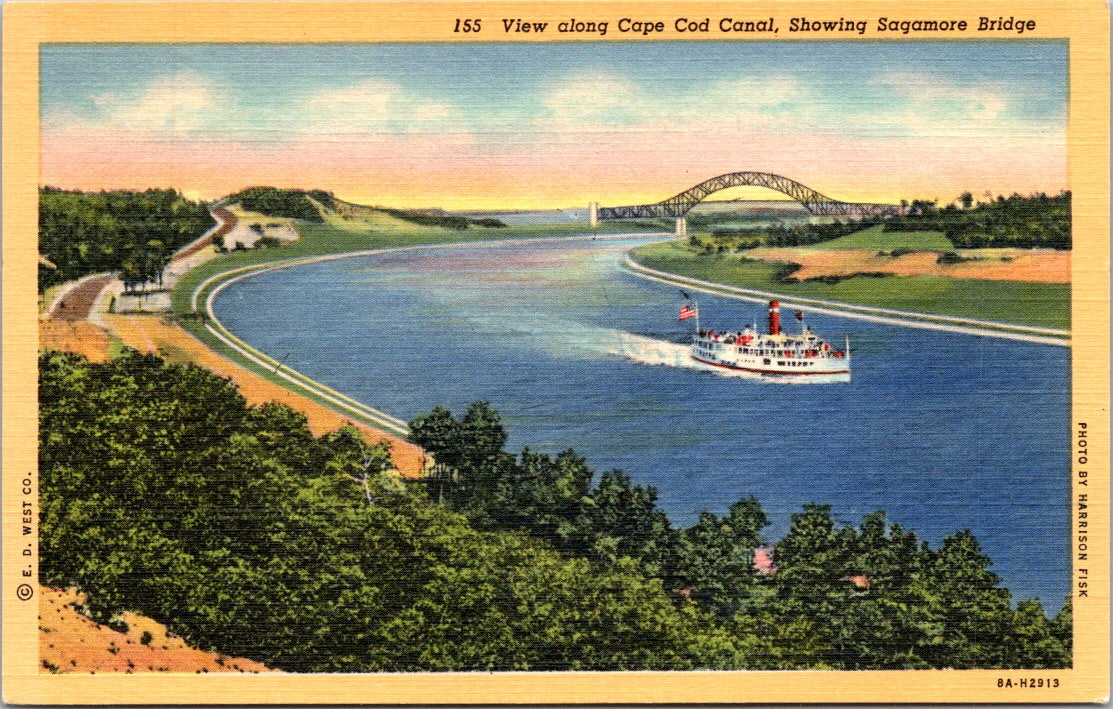 Vintage Postcard View Along Cape COD Canal Showing Sagamore Bridge Massachusetts