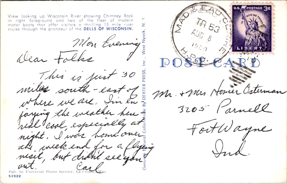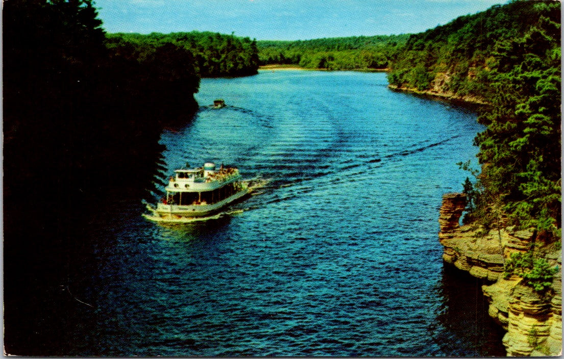 Vintage Postcard View Looking Up Wisconsin's River Showing Chimney Rock Posted