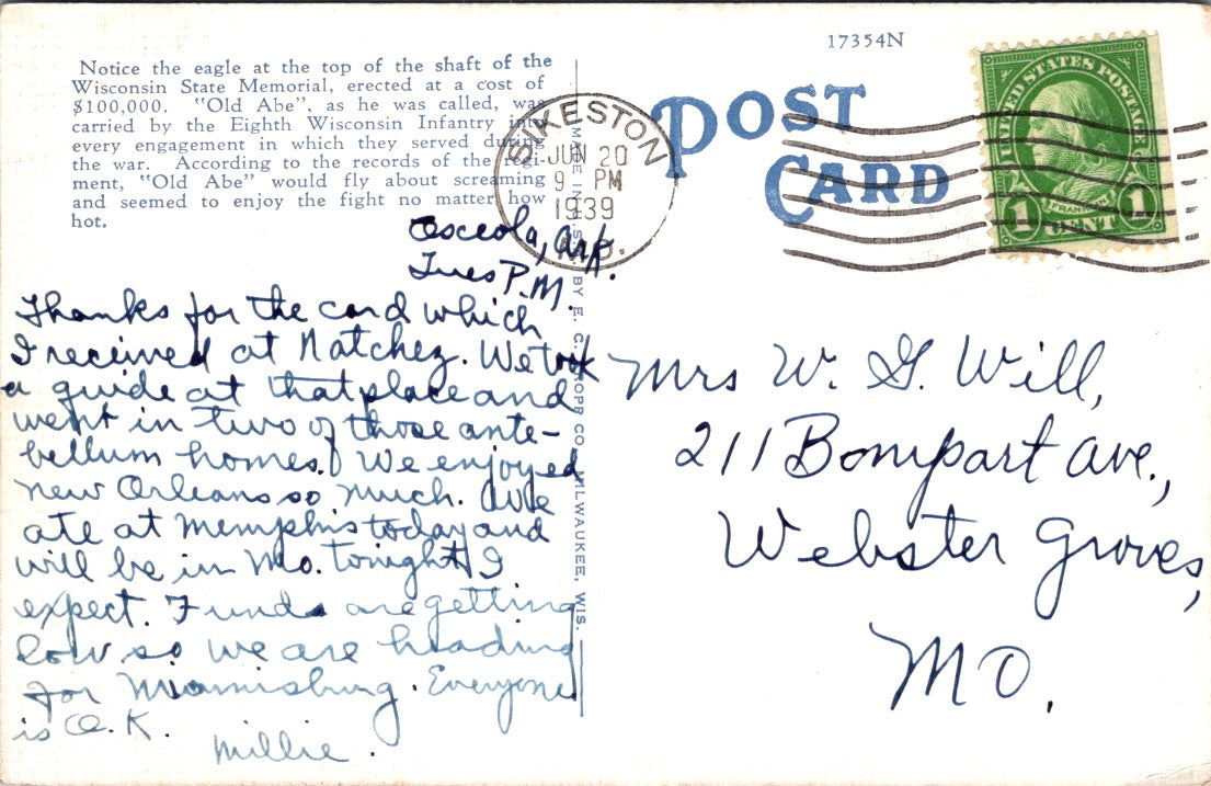 Vintage Postcard Wisconsin Memorial National Military Park Vicksburg Missouri