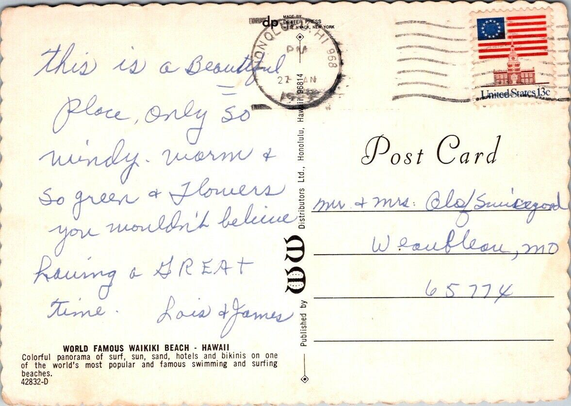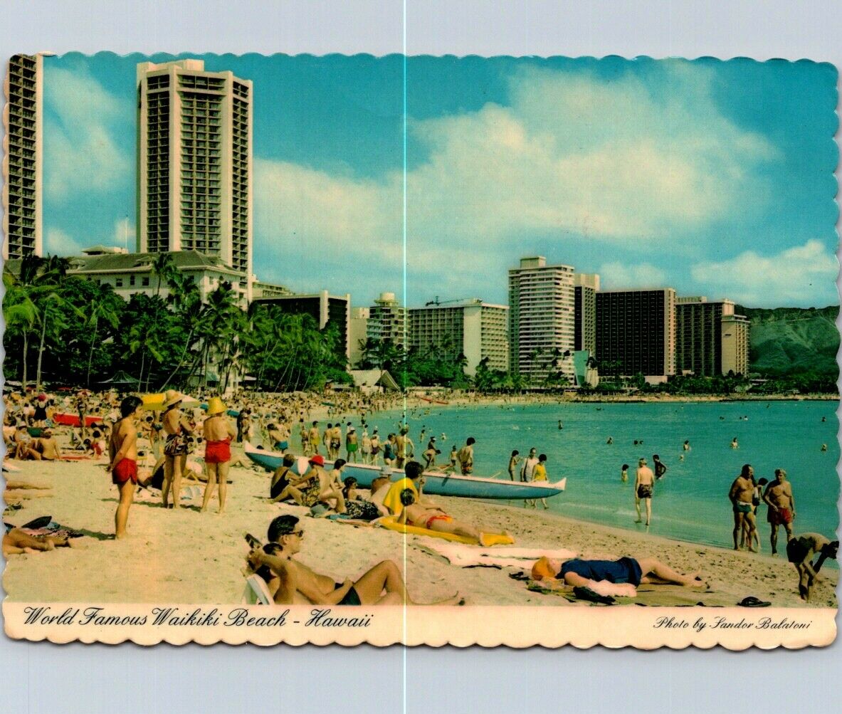 Vintage Postcard World Famous Waikiki Beach Hawaii Surf Sand Hotel Panorama