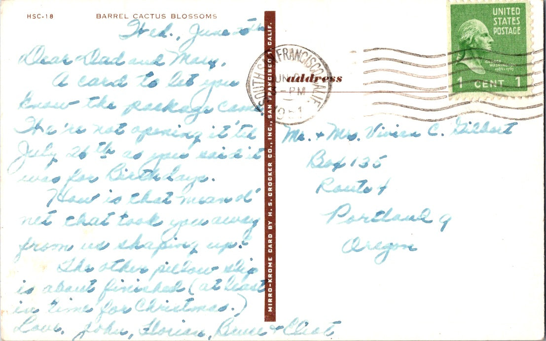 Vintage Postcard Yellow Barrel Cactus Blossoms Posted 1951 US Postage One Cent