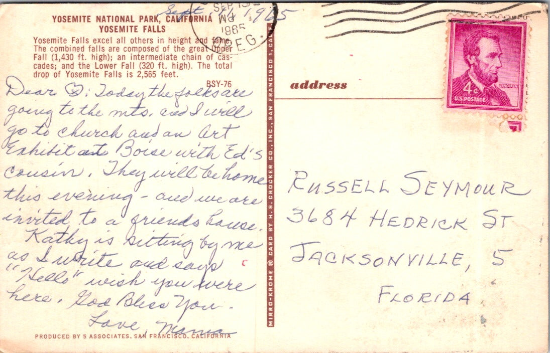 Vintage Postcard Yosemite National Park California Yosemite Falls Posted 1965