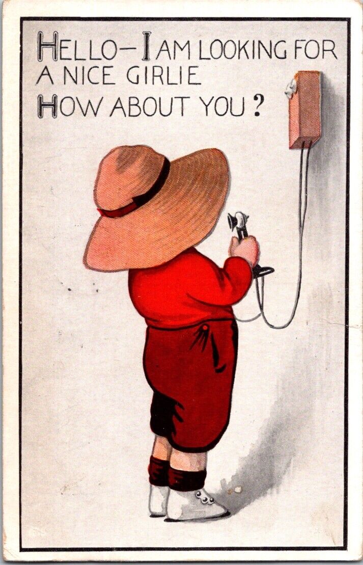 Vintage Postcard Young Boy On Telephone Looking For A Nice Girlie Posted 1913